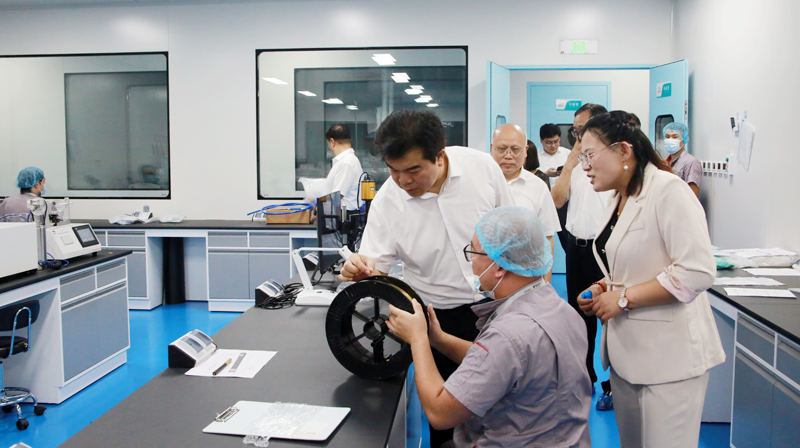投產儀式后,王俊紅書記,省市縣各級領導,正定縣鄉鎮、街道相關部門主要負責同志,在張總帶領下走進高標準萬級潔凈車間。王俊紅書記與工人們進行了親切交談,了解了注塑、擠出、編織等制造工藝。通過張總的詳細講解,大家對公司的研發創新、產品體系以及未來市場等情況有了更加全面的了解。